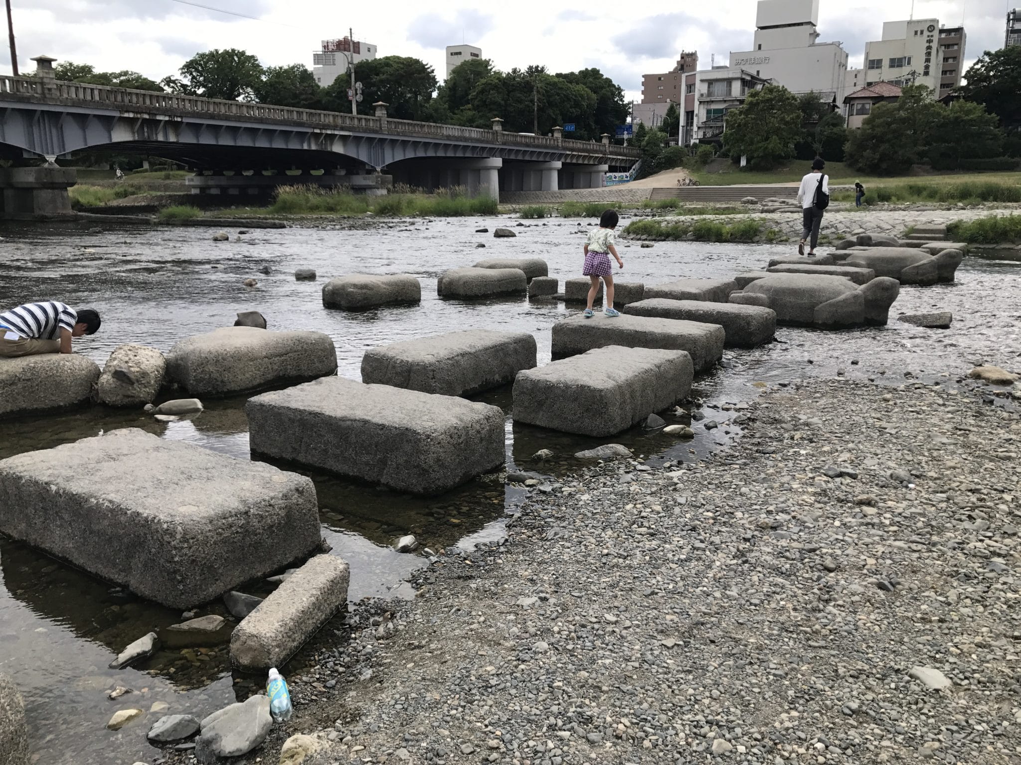 出町柳に戻ったのは14時30分過ぎ。そこから出町柳のデルタに。いつ来てもこの場所は心地良く、私たち家族同様に、川に置かれた飛び石を渡る親子の方々や、音楽を聞いたり楽器を演奏したりしている学生達の姿がそこにはありました。
