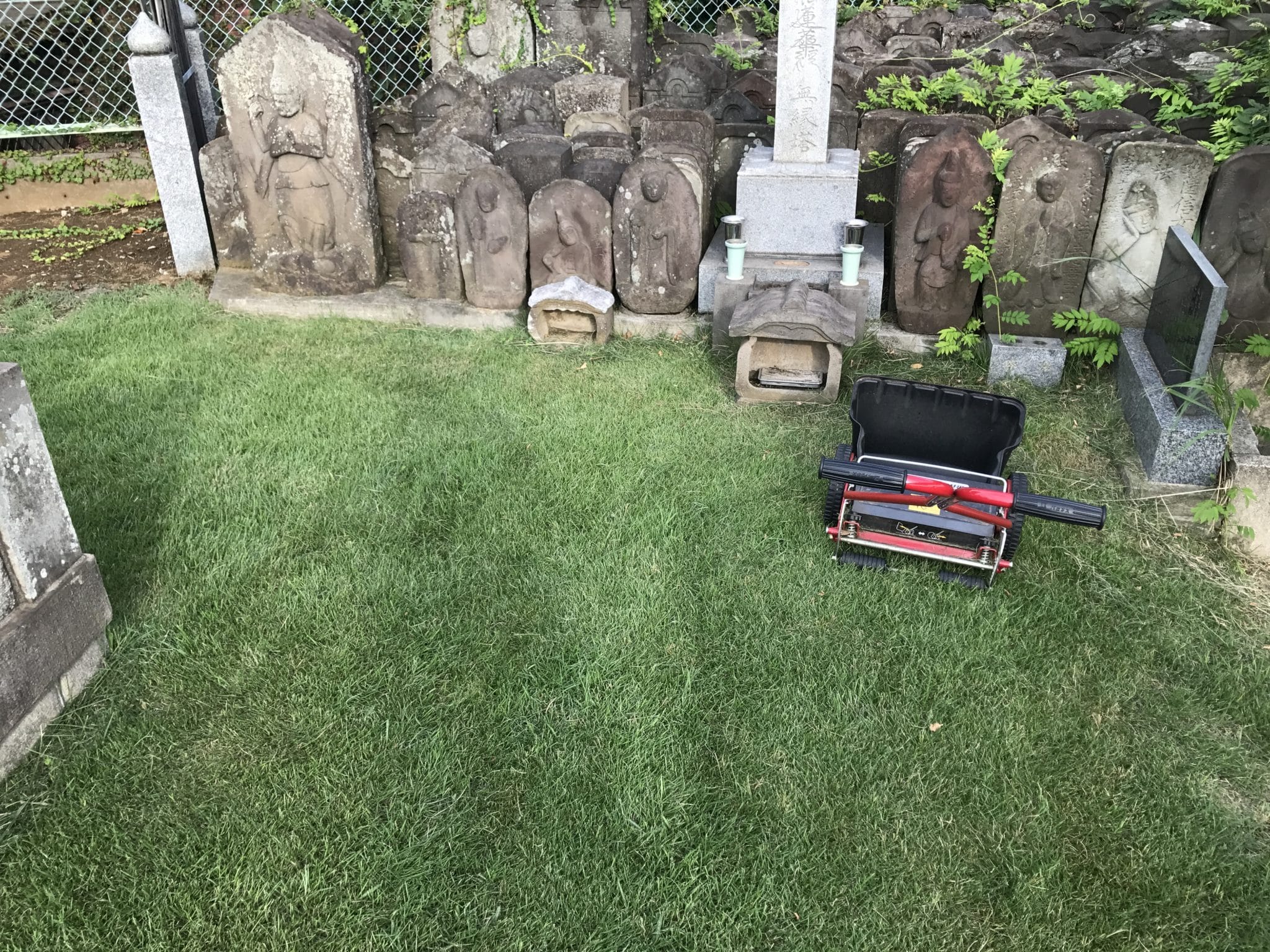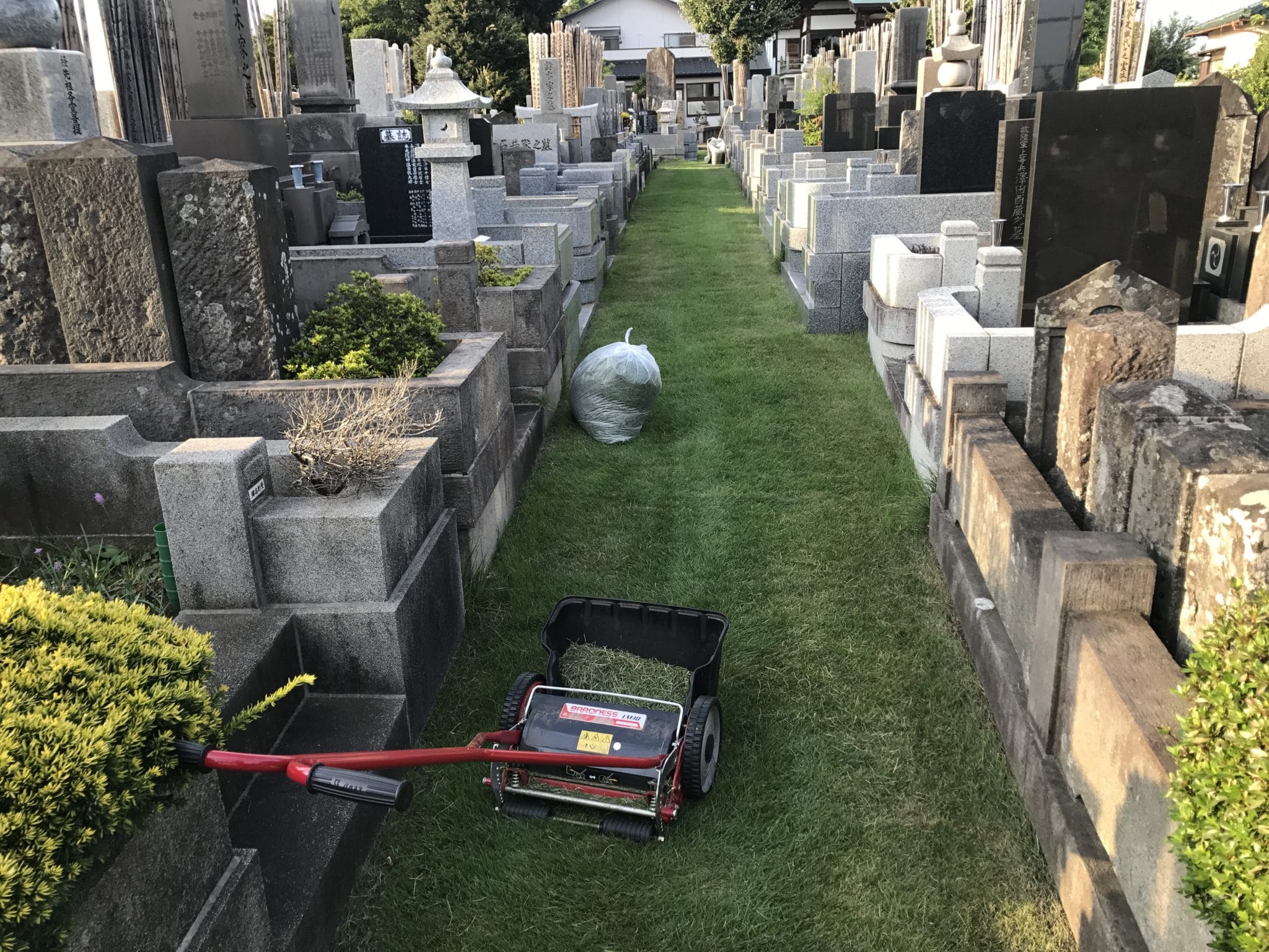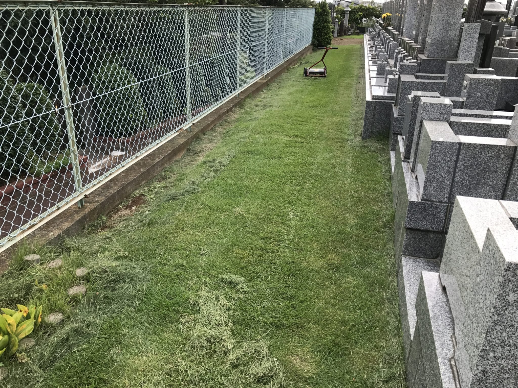 本日は台風で散らかった落ち葉等を掃除することに加え、境内墓地の芝刈です。