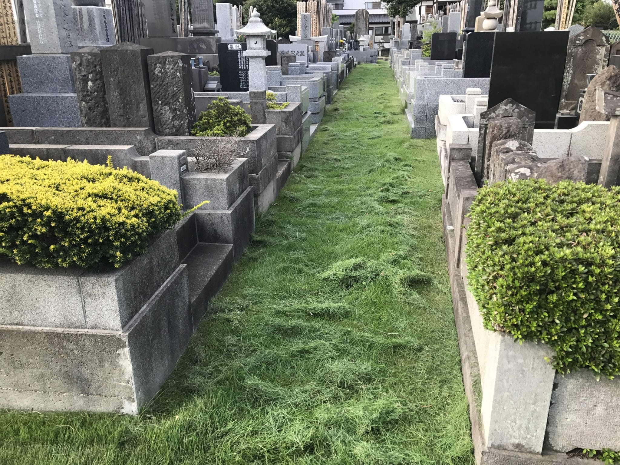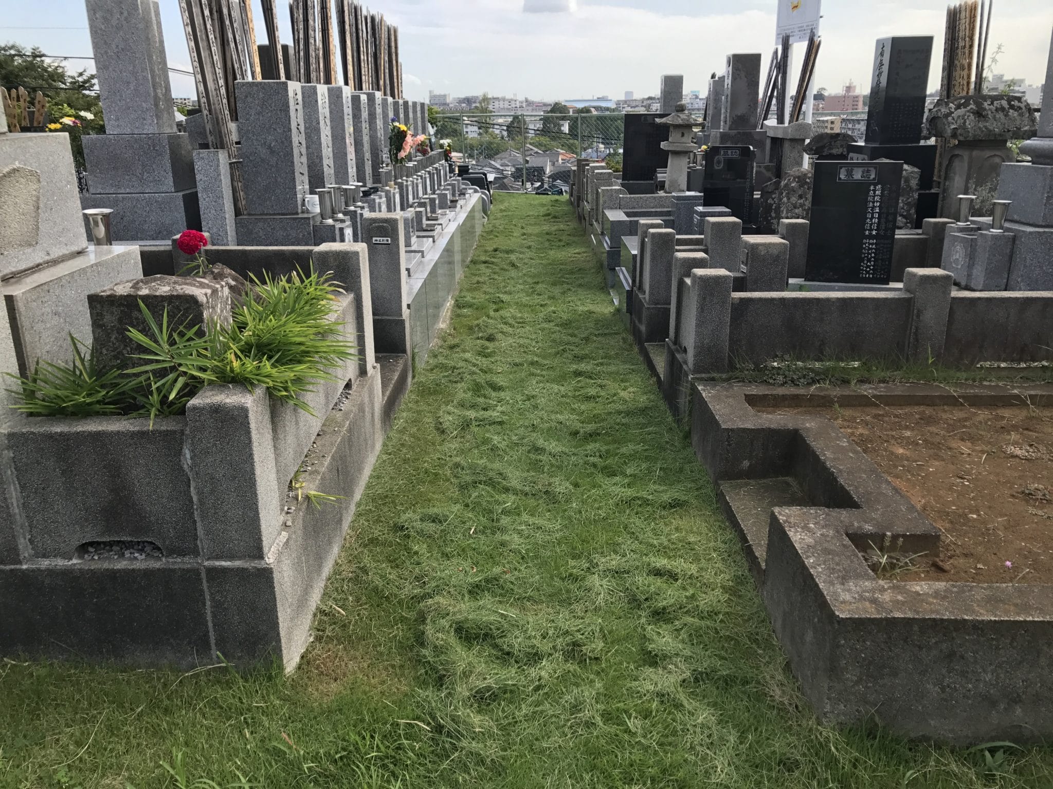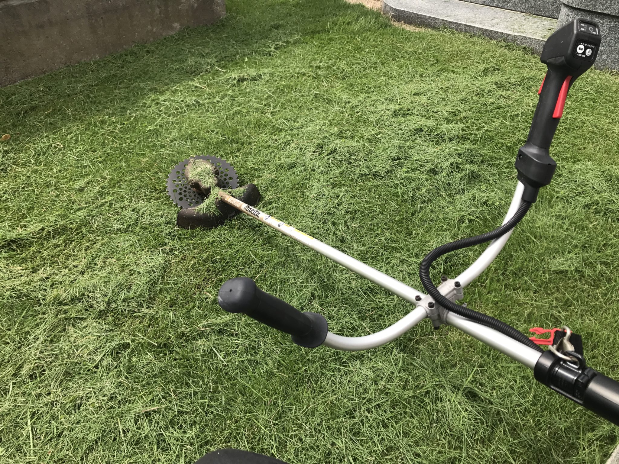 本日は台風で散らかった落ち葉等を掃除することに加え、境内墓地の芝刈です。