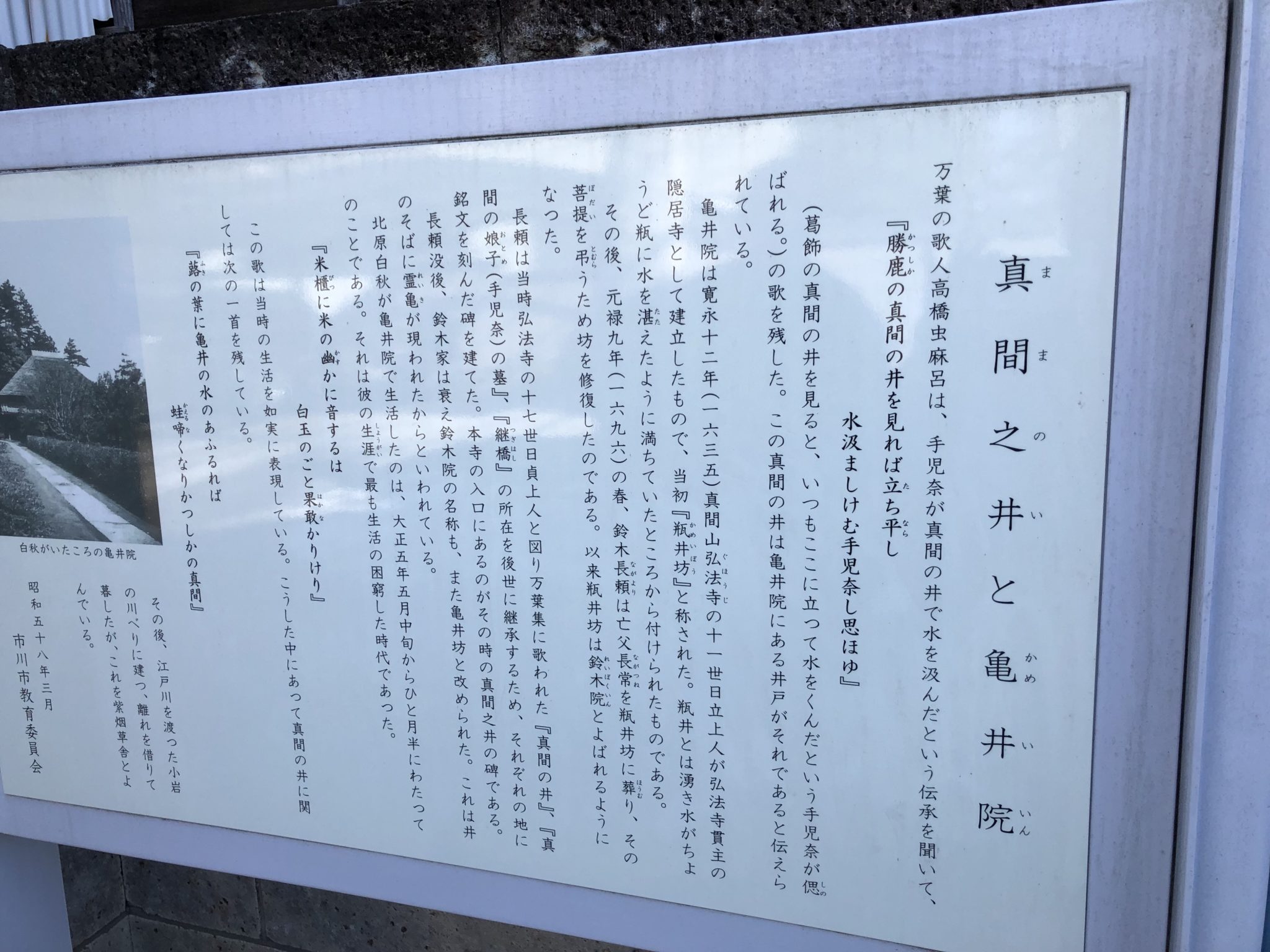 (葛飾の真間の井を見ると、いつもここに立って水をくんだという手児奈が偲ばれる。)の歌を残した。この真間の井は亀井院にある井戸がそれであると伝えられている。)