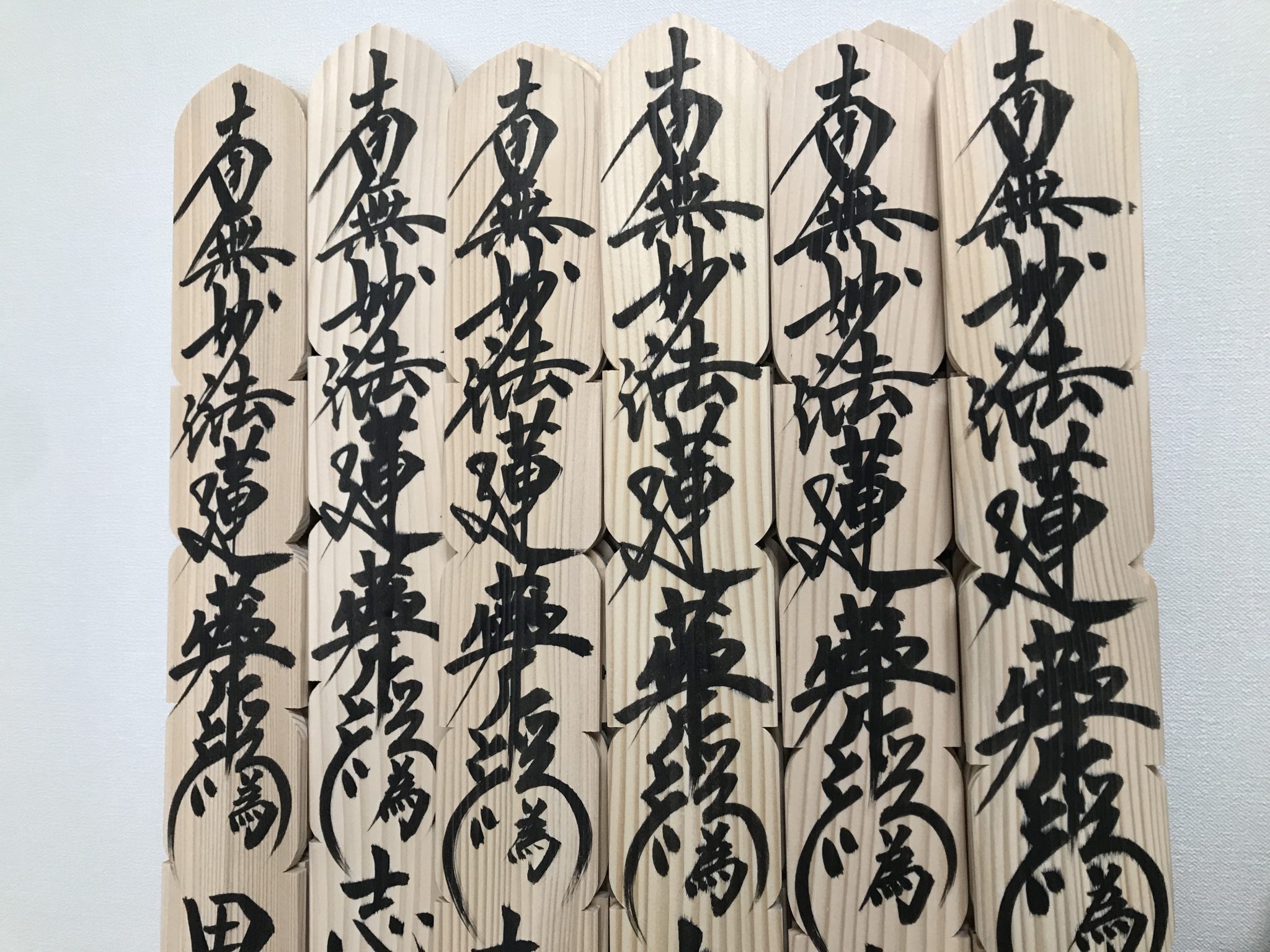 以前までは、「如説修行 功徳甚多」と書いておりましたが、祖父の掛け軸に上記言葉が書かれていたので、最近ではこちらの言葉を書くようにしております。
