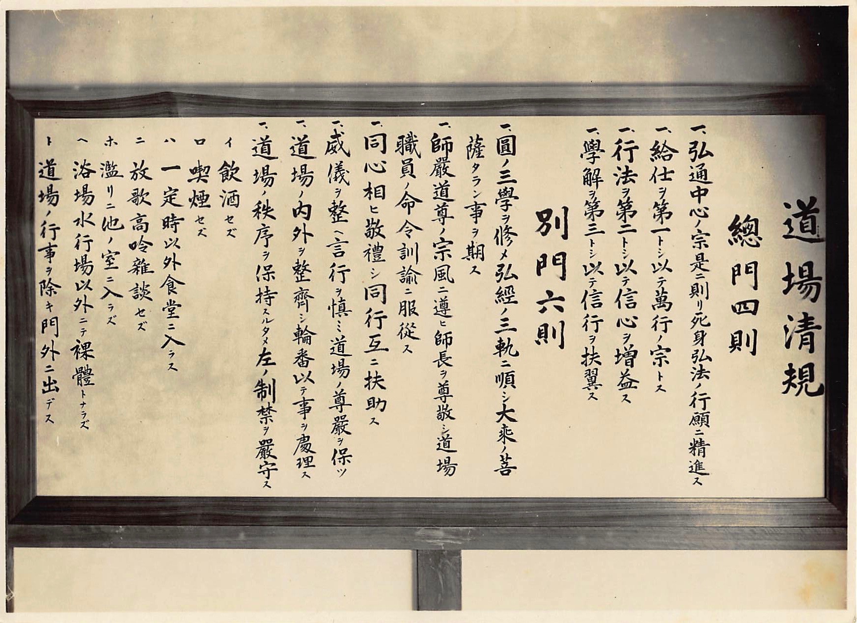 後日わかったことなのですが、以下に示す『日蓮宗事典』によると、昭和12年8月1日に初めて開設したという記述がありました。そのため、上記写真の昭和15年は第1回ではないようです。今回たまたま発見された写真が昭和15年の信行道場のものであったので真偽の程はわかりませんが、ひょっとしたら昭和15年より前の年も、雲洞上人は信行道場に携わっていたかもしれません。いずれにせよ信行道場の創設期に指導者として日蓮宗の僧侶の育成に尽力したことは間違いありません。