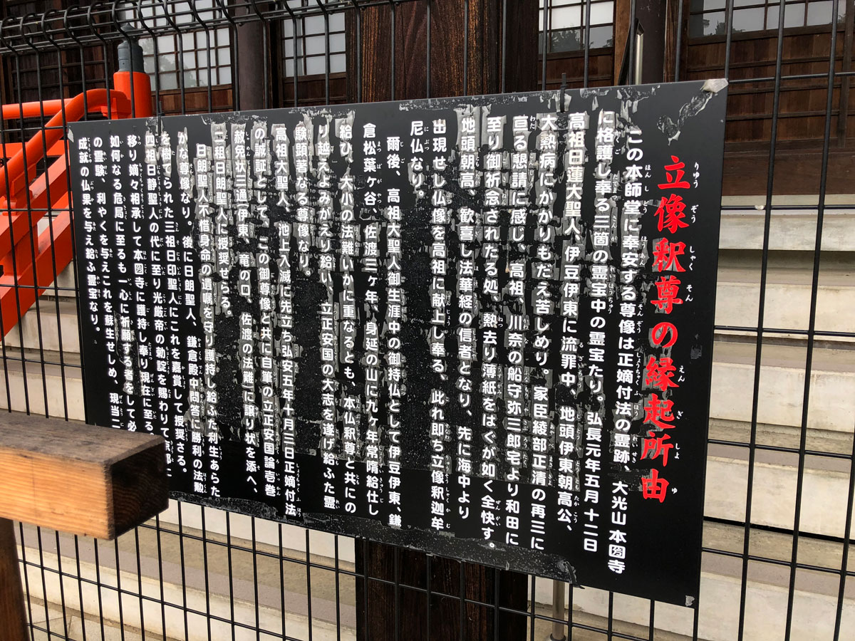 宗祖は入滅に先立つ弘安5年(1282)10月3日に、本師堂泰安の「立像釈尊像」(聖人が四大法難克服のご生涯のご持仏で、現当二世の諸願を成就せしめ、蘇生の霊験あらたかと伝えられる)、「三赦免状」(伊豆・龍ノ口・佐渡の法難を立証する重要な許状)、そして『立正安国論』(本圀寺所蔵本は聖人がご生涯御所持の宗祖ご真筆広本)を正嫡付法の譲状とともに日朗上人に授与された。これが当山の「三箇の霊宝」である