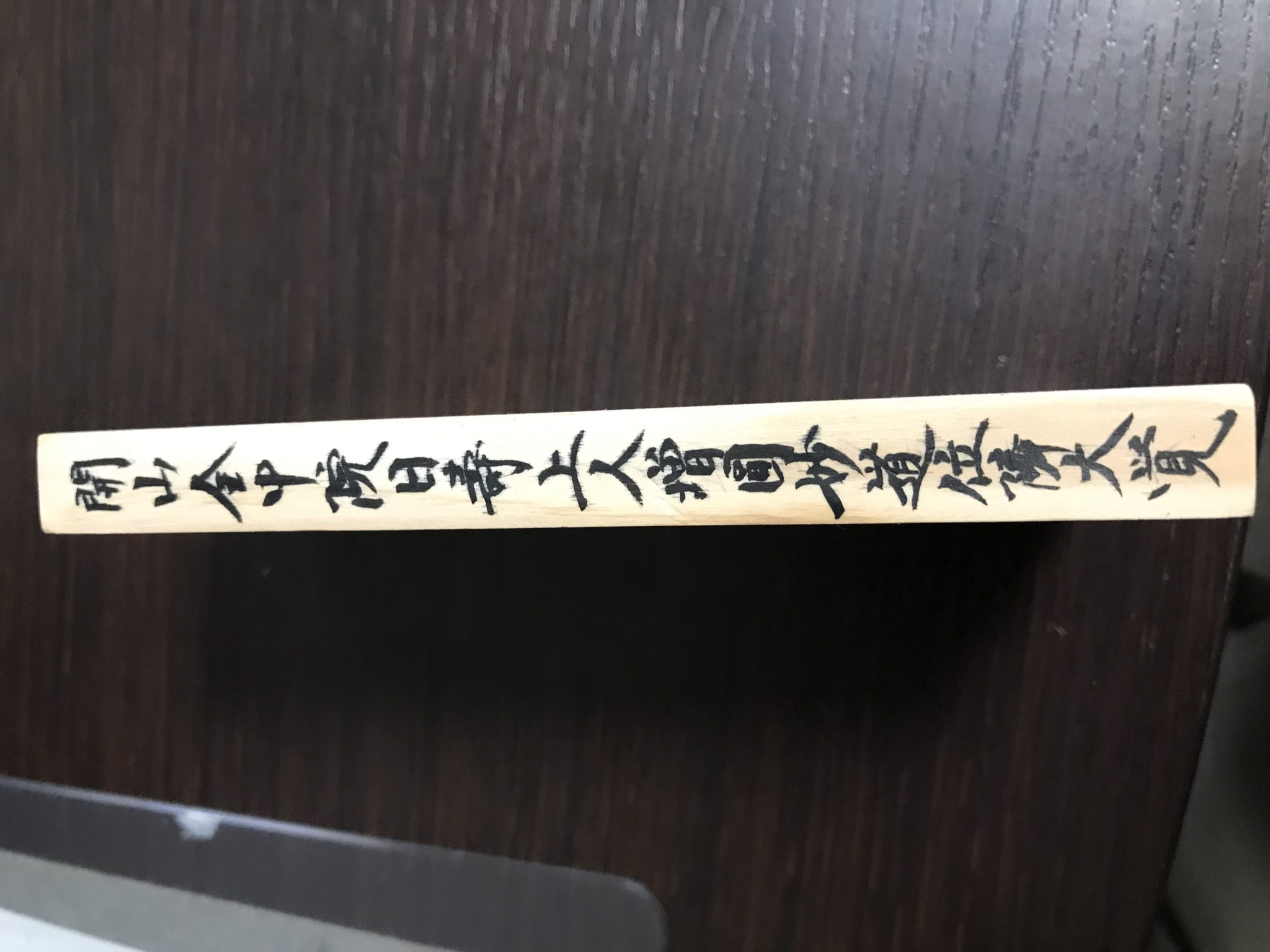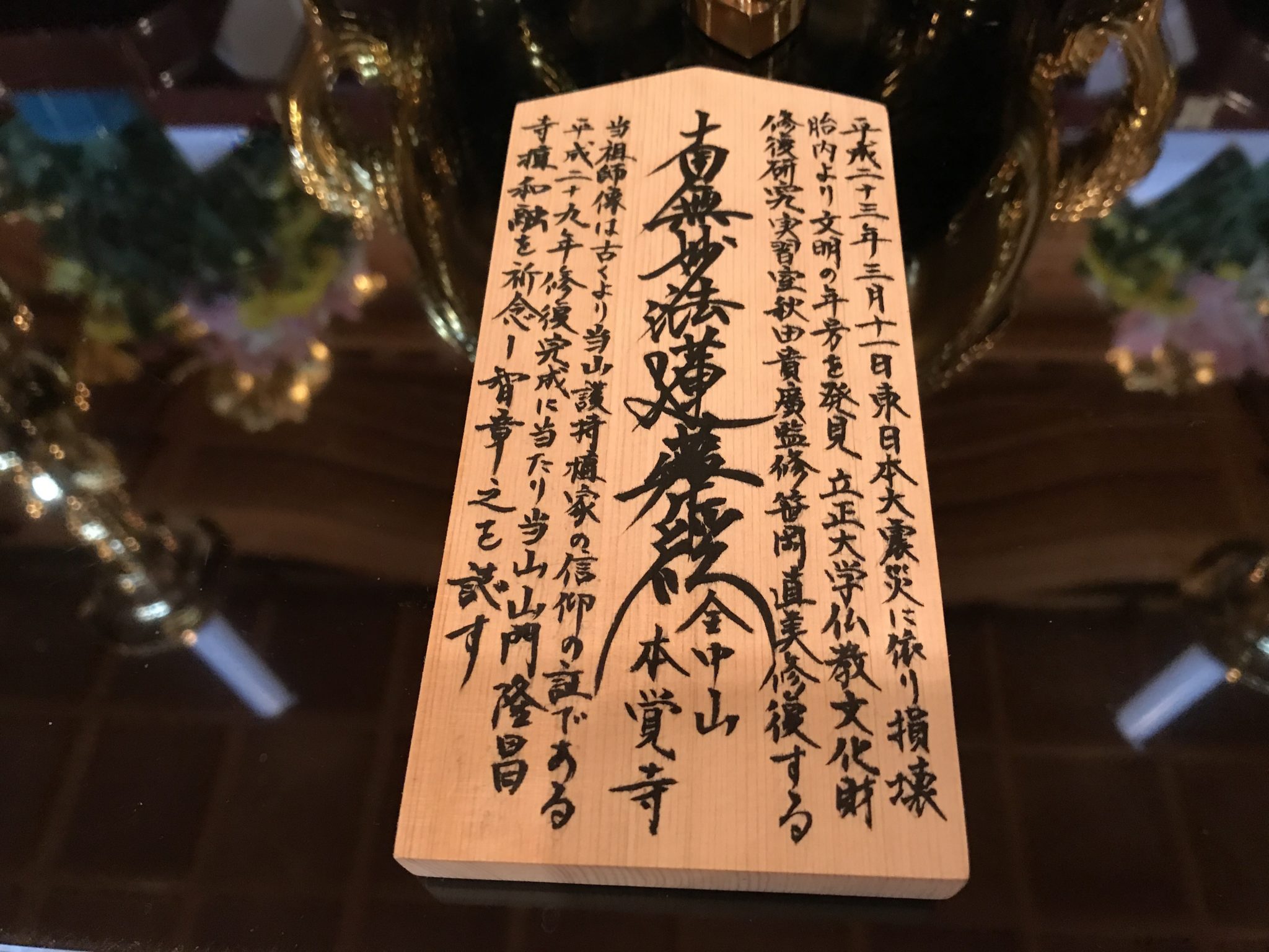 17時より津田沼にてお通夜なのですが、その前に本覚寺にて発見された日蓮聖人像の修復記録を木札に記しました。