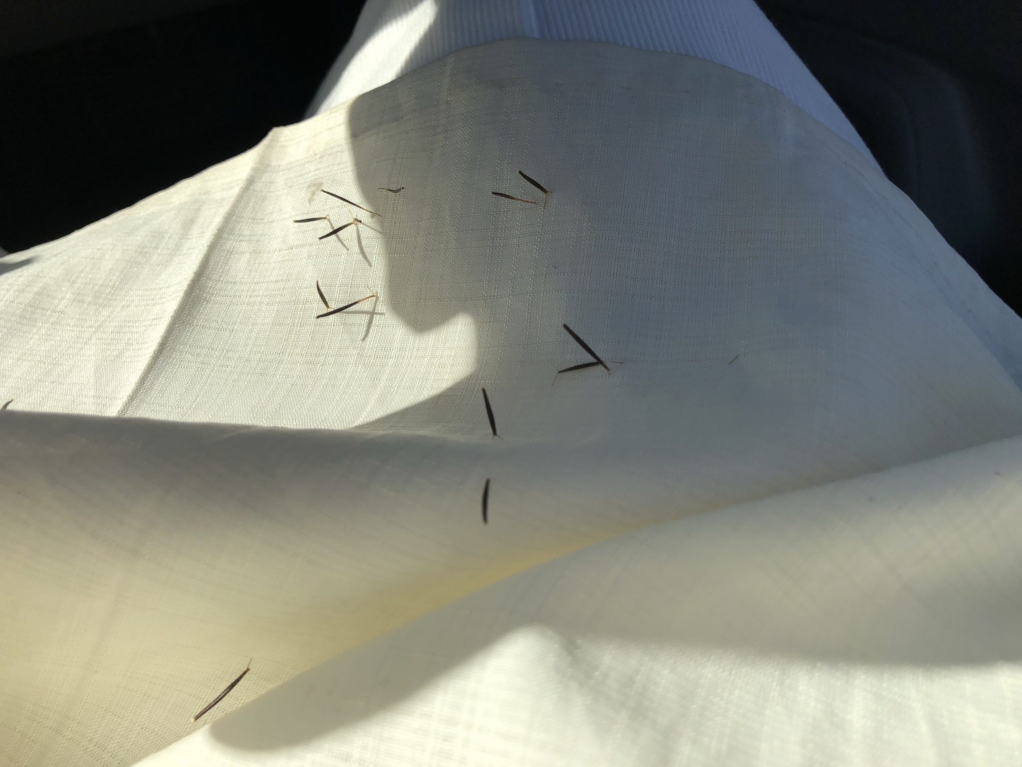 その後、先月御会式であげていただいた卒塔婆を八柱霊園のお墓まで運びました。草むらを通過した際に、雑草の種が衣にこびりついてしまい、落とすのに苦労しました。