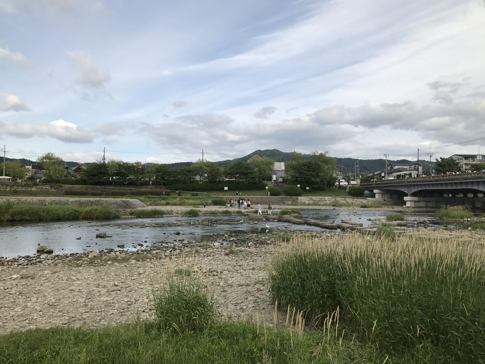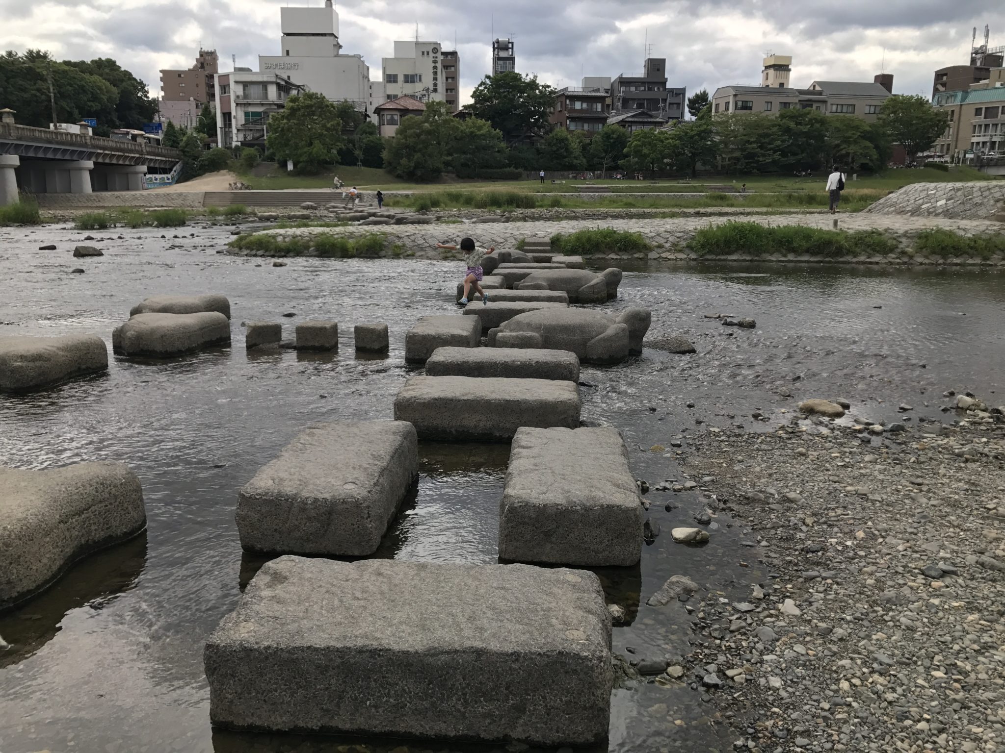 出町柳に戻ったのは14時30分過ぎ。そこから出町柳のデルタに。いつ来てもこの場所は心地良く、私たち家族同様に、川に置かれた飛び石を渡る親子の方々や、音楽を聞いたり楽器を演奏したりしている学生達の姿がそこにはありました。