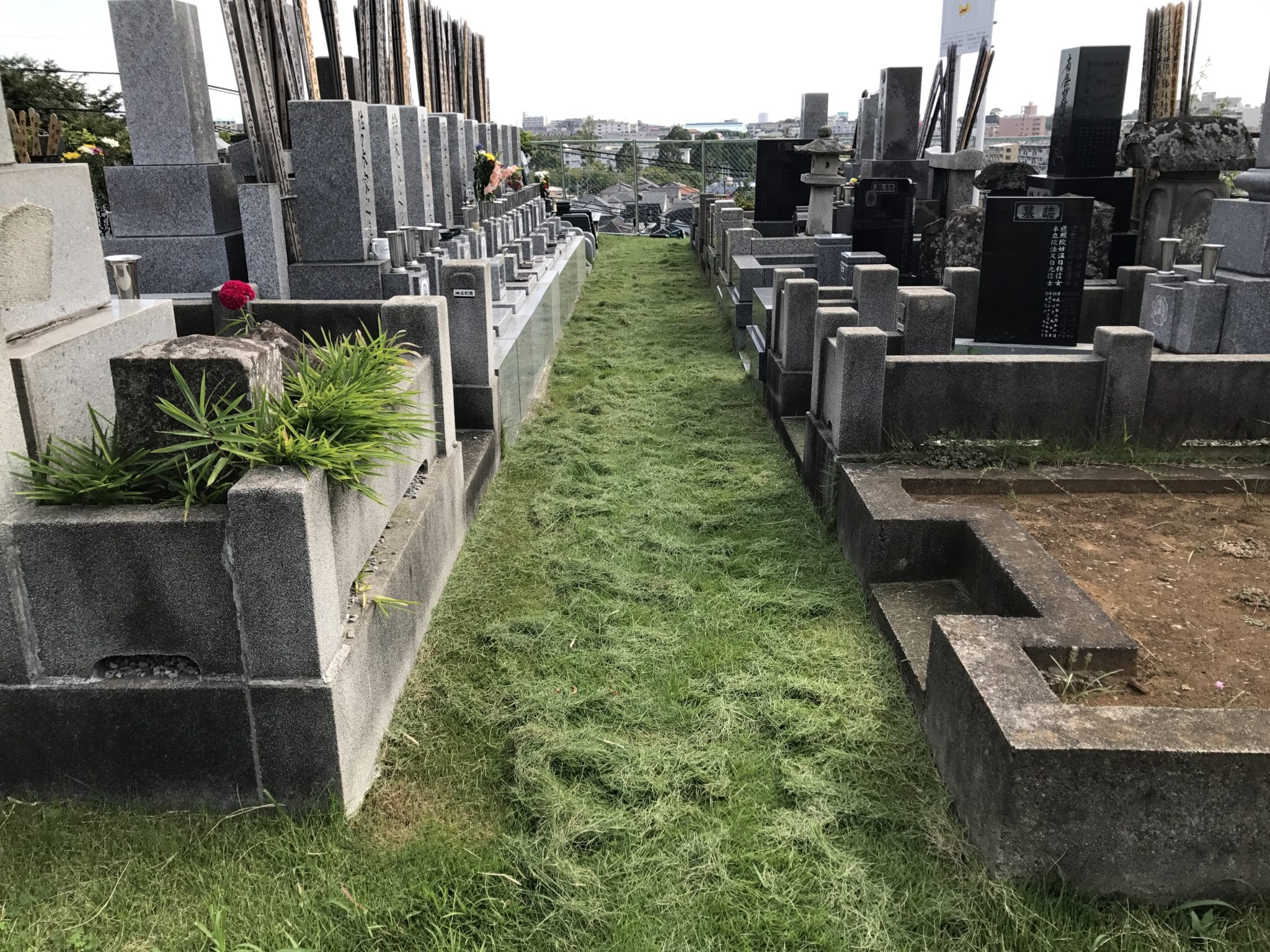 本日は台風で散らかった落ち葉等を掃除することに加え、境内墓地の芝刈です。