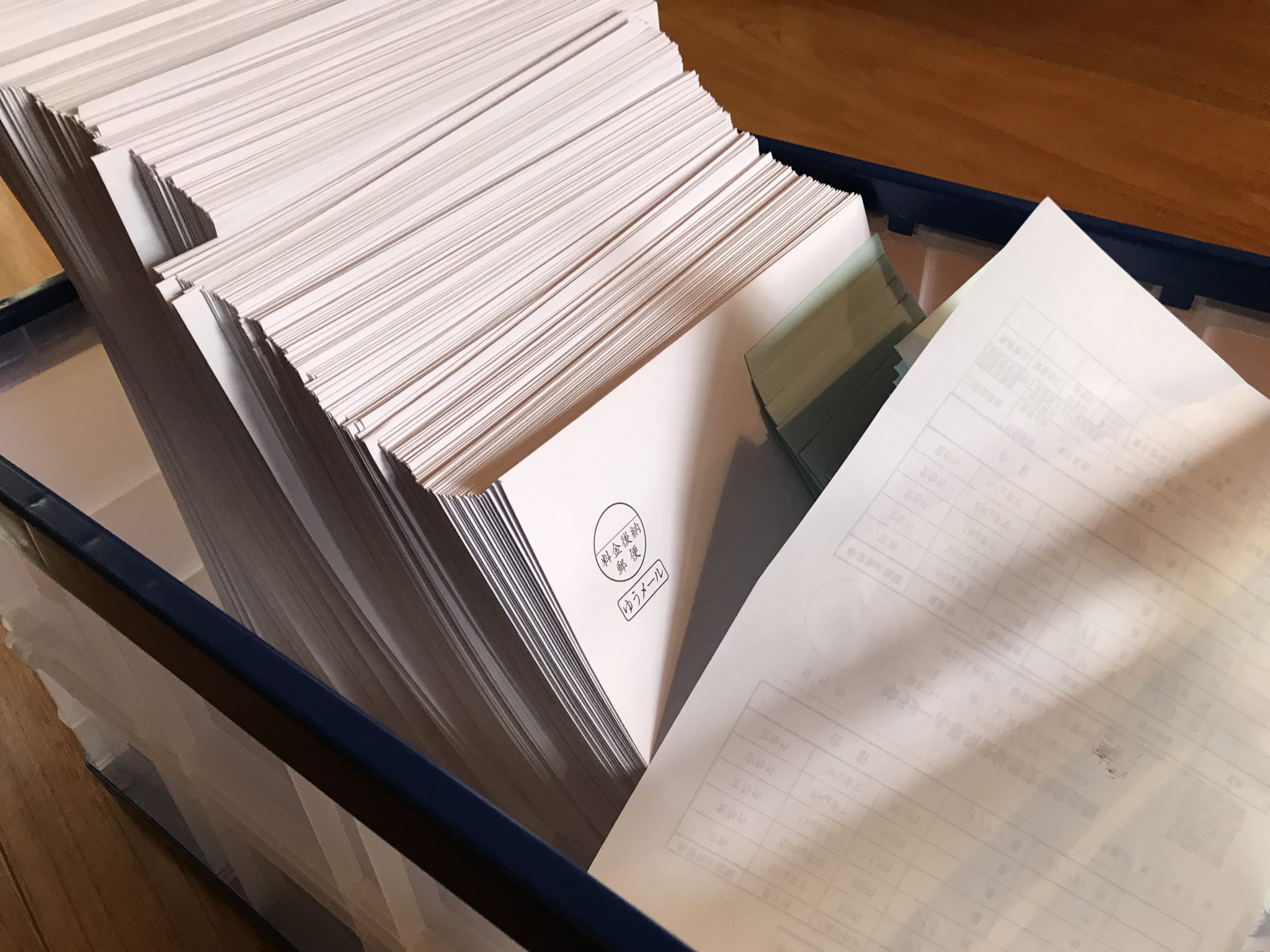 彼岸会の案内状の準備です。10時〜12時の間に郵便局の方が取りに来てくれる予定なので、それまでに発送を完成させます。