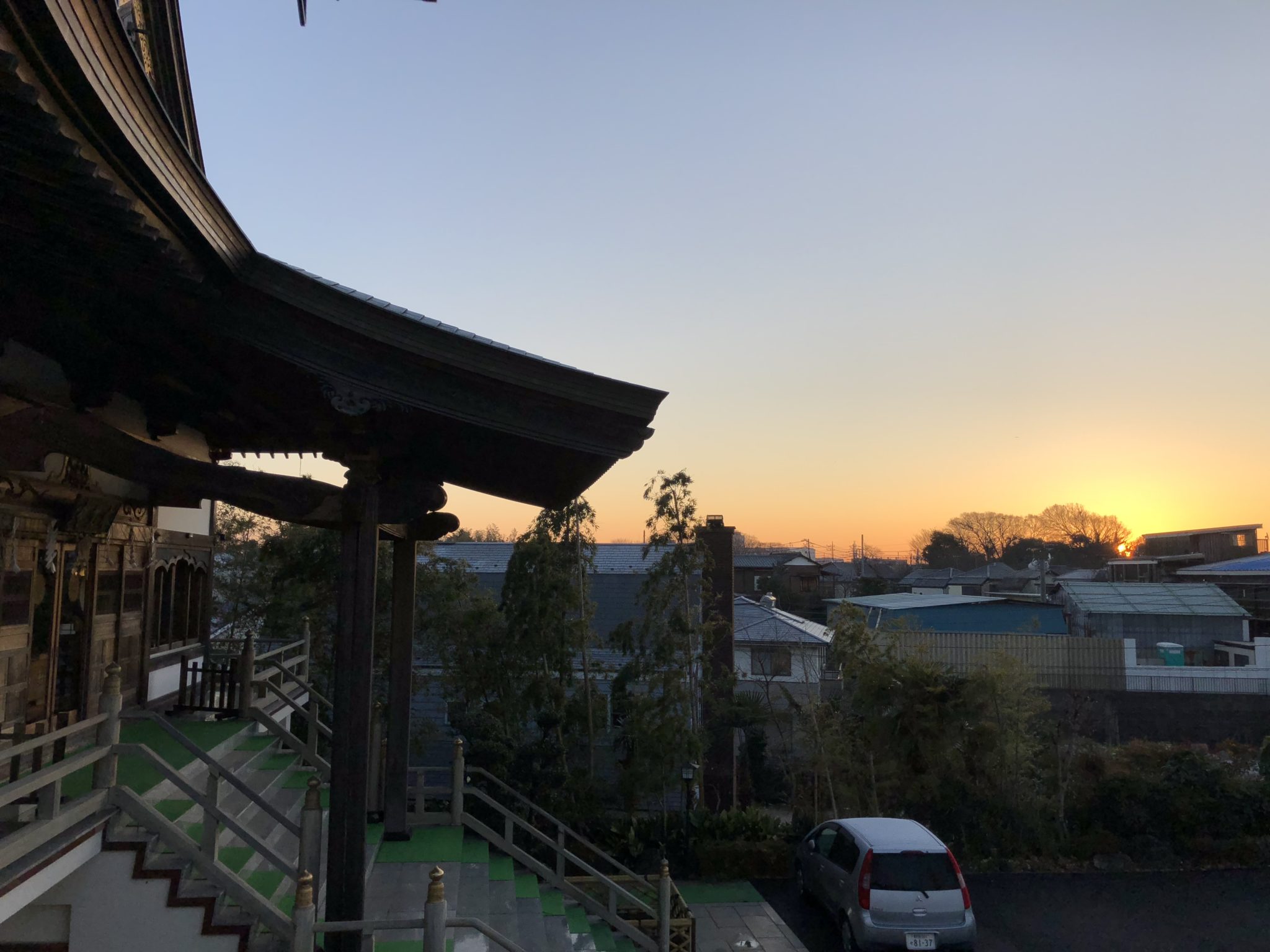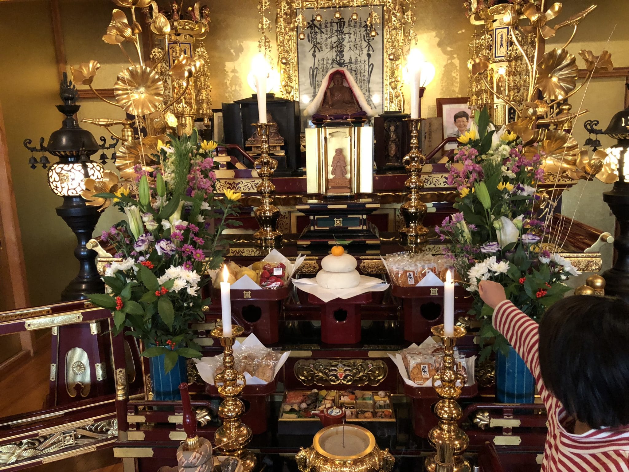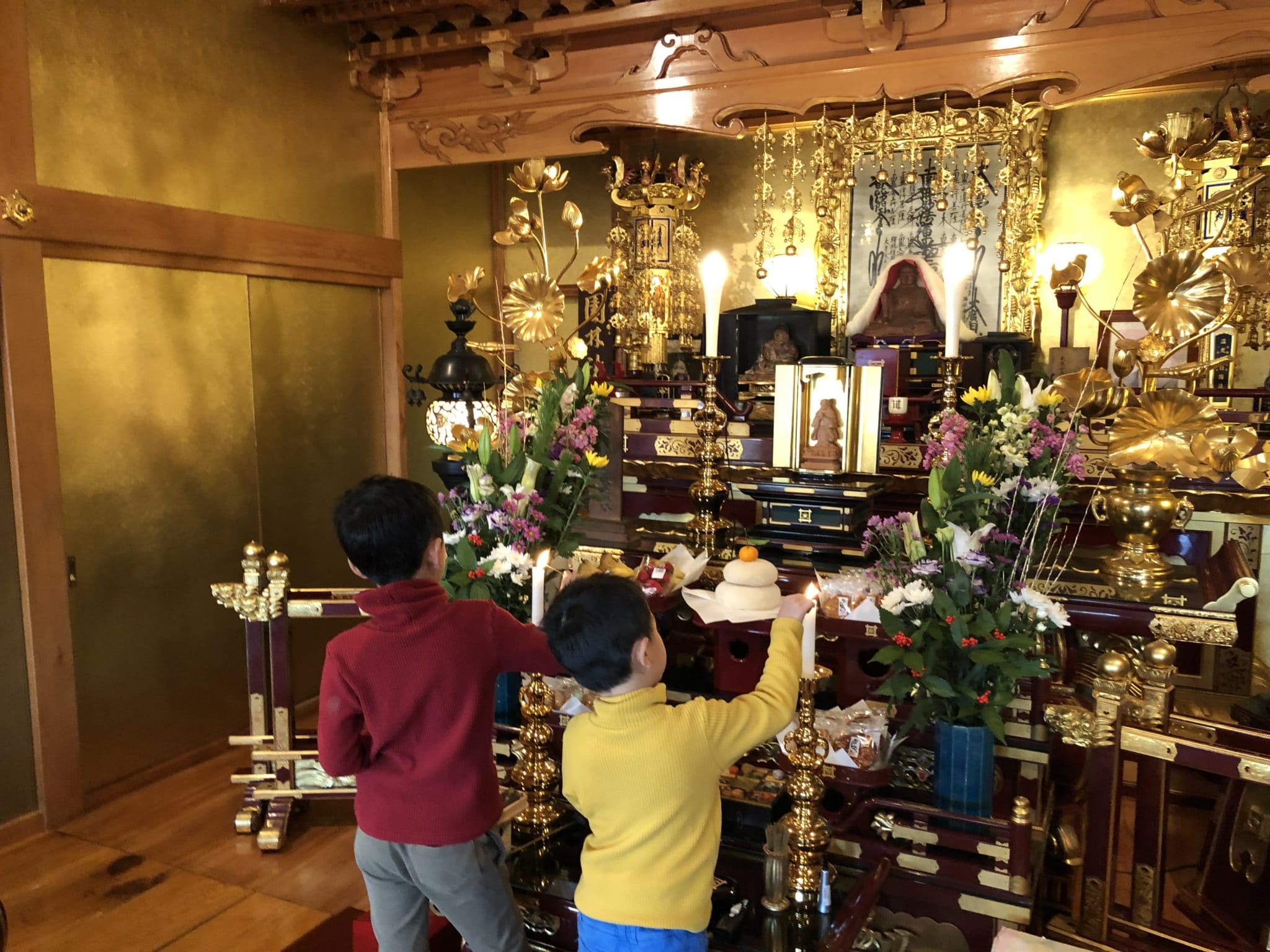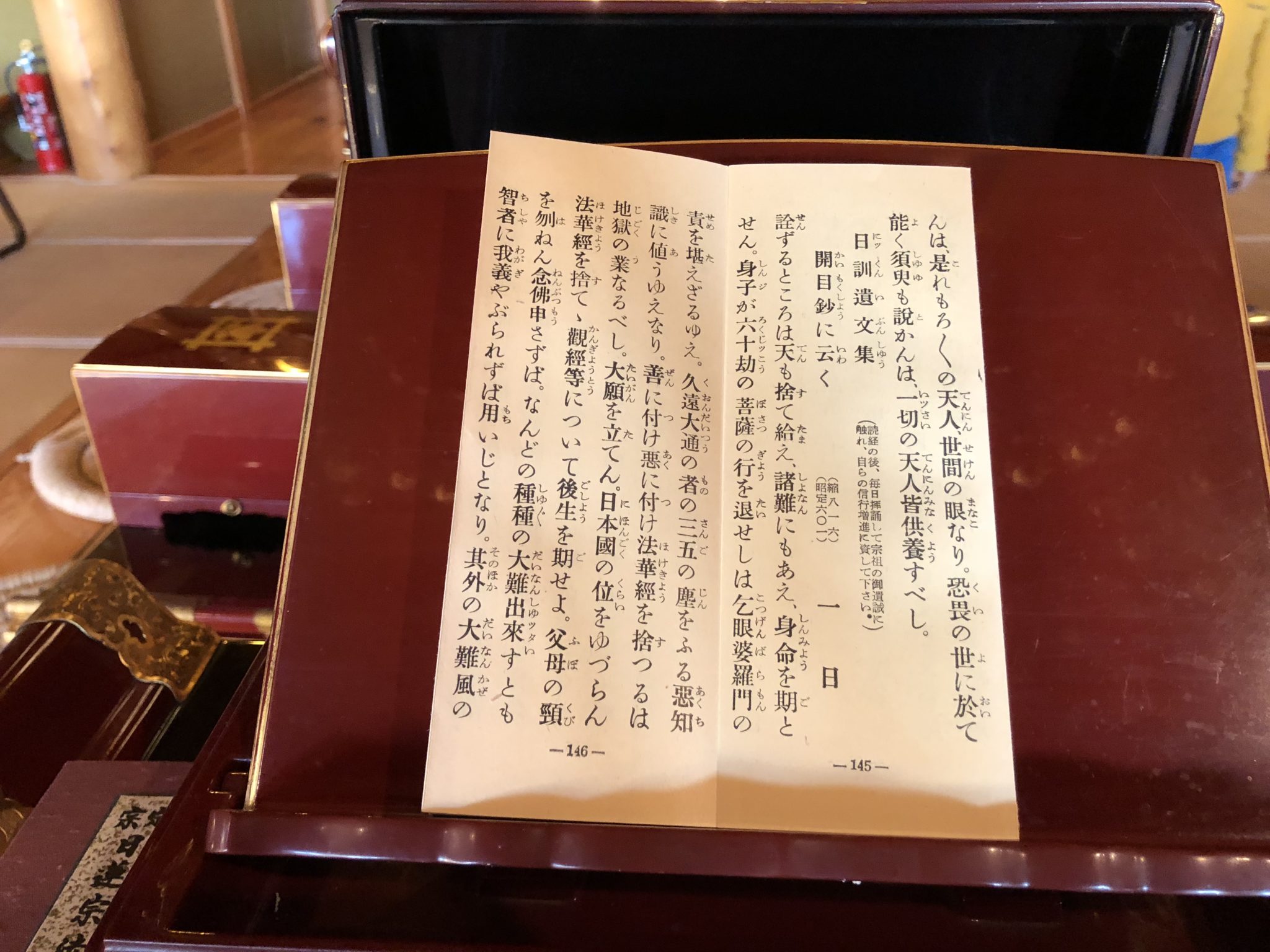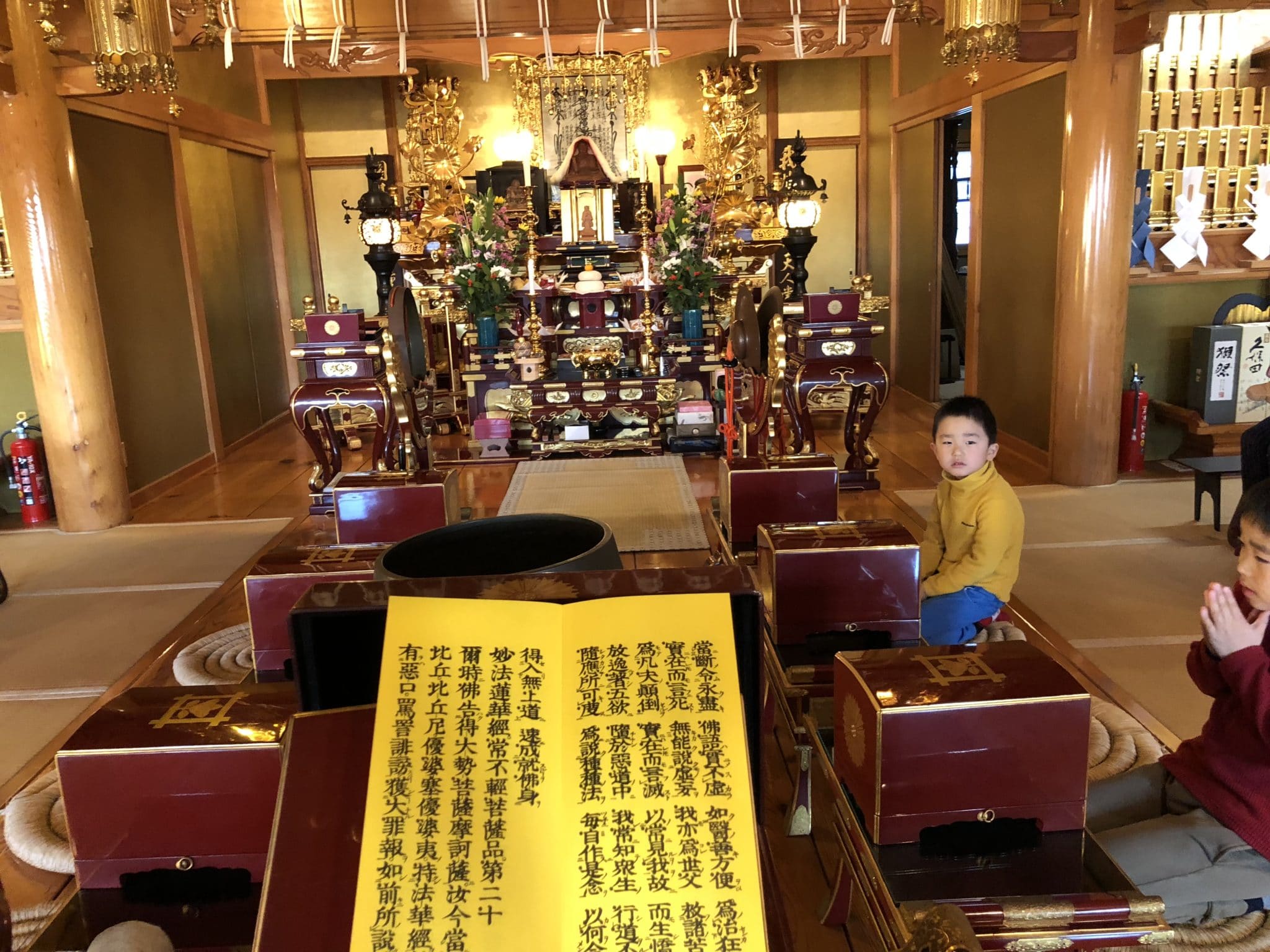 本覚寺にて朝勤です。本日の日蓮聖人の御遺文は『観心本尊抄』です。今朝は家族全員でのお勤めです。