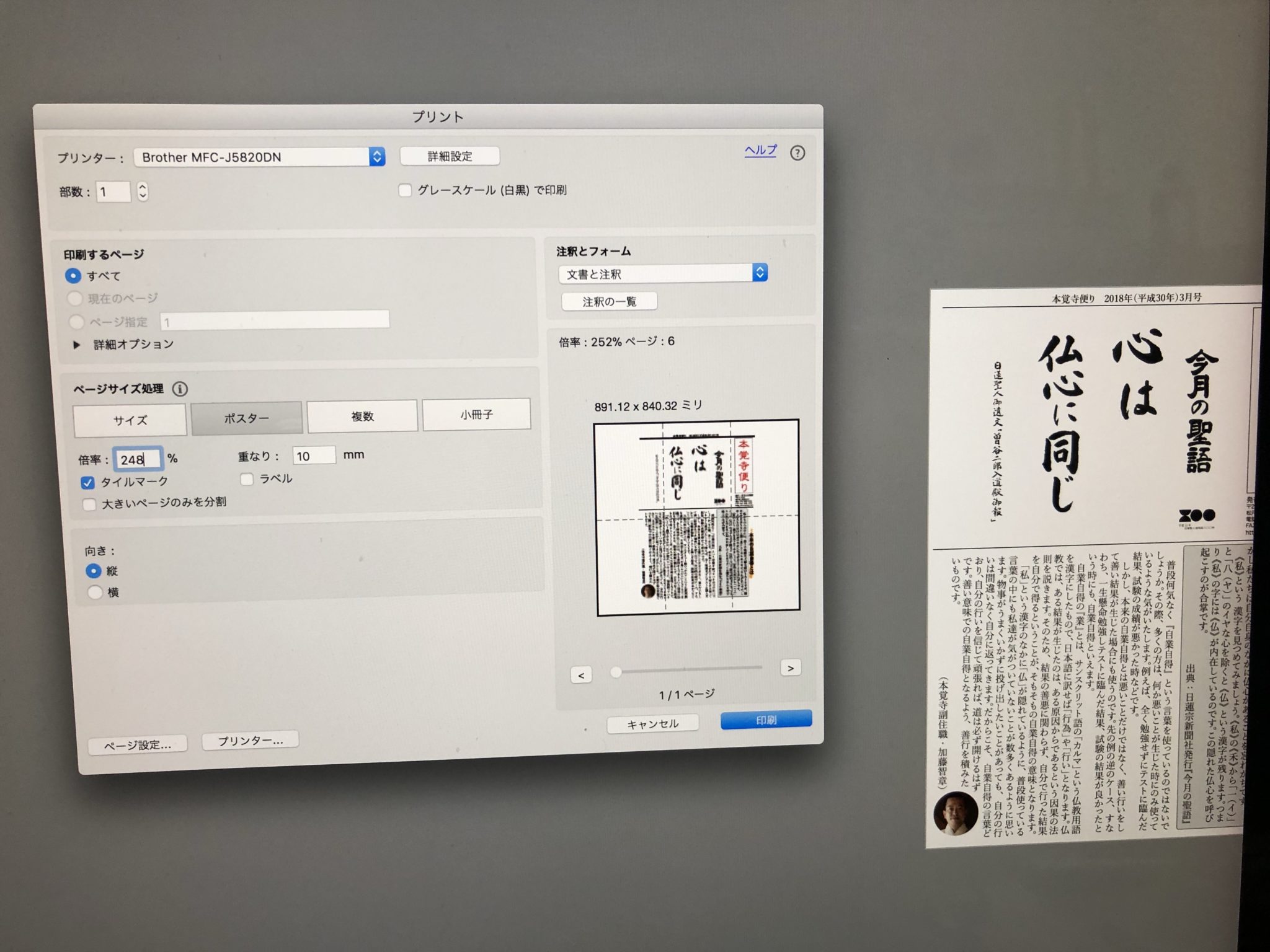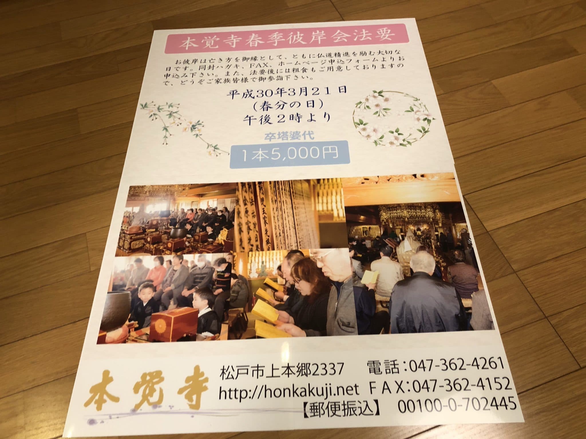 数日前に本覚寺の檀家さん向けに寺報を発送しました。その寺報を本覚寺参道の掲示板に掲載するため、A3用紙を4枚使い、タイル印刷(ポスター印刷)することによって、かなり大きな寺報となります。