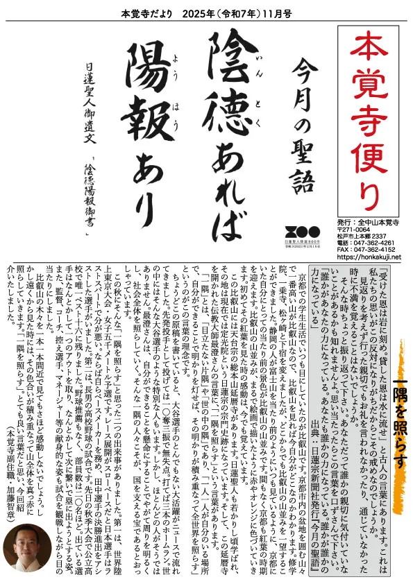 この比叡山には天台宗の総本山延暦寺があります。日蓮聖人も若かりし頃学ばれ、その地は現在では定光院という日蓮宗の宗門史跡になっています。そして、この延暦寺を開かれた伝教大師最澄さんの言葉に、「一隅を照らす」という言葉があります。